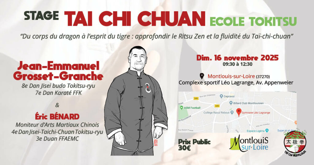 Taï-Chi Montlouis organise un stage exceptionnel de Taï-Chi-Chuan (École Tokitsu), dirigé par Senseï Jean-Emmanuel GROSSET-GRANCHE, professeur diplômé d’État, 8e Dan en Jisei-Budo Tokitsu-ryu, 7e Dan en Karaté Shotokan & instructeur de l’académie Paturel.